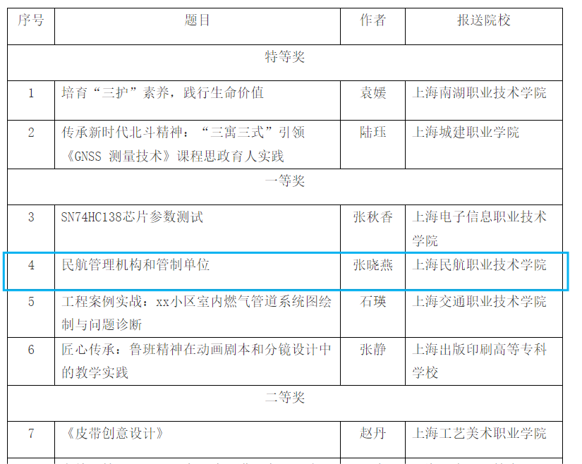 近日,在上海高职高专思想政治理论课建设联盟、上海市高职高专课程思政与文化素养教育教学指导委员会和上海市职业学校思政课建设协作组等单位联合开展的上海高职高专首届课程思政优秀(经典)案例评选中,由我校马克思主义学院柳心欢院长指导、空港管理学院张晓燕教授主持、“空中交通管理基础”教学团队(张晓燕、柳心欢、郭淼、谢丽)撰写的课程思政案例“民航管理机构和管制单位”脱颖而出,荣获一等奖。这一佳绩充分彰显了我校在深入推进职业教育课程思政内涵式发展和质量提升、落实“立德树人”根本任务方面取得的显著成效,是我校在上海市高职高专领域内课程思政建设成果高水平检阅中的质效展现。