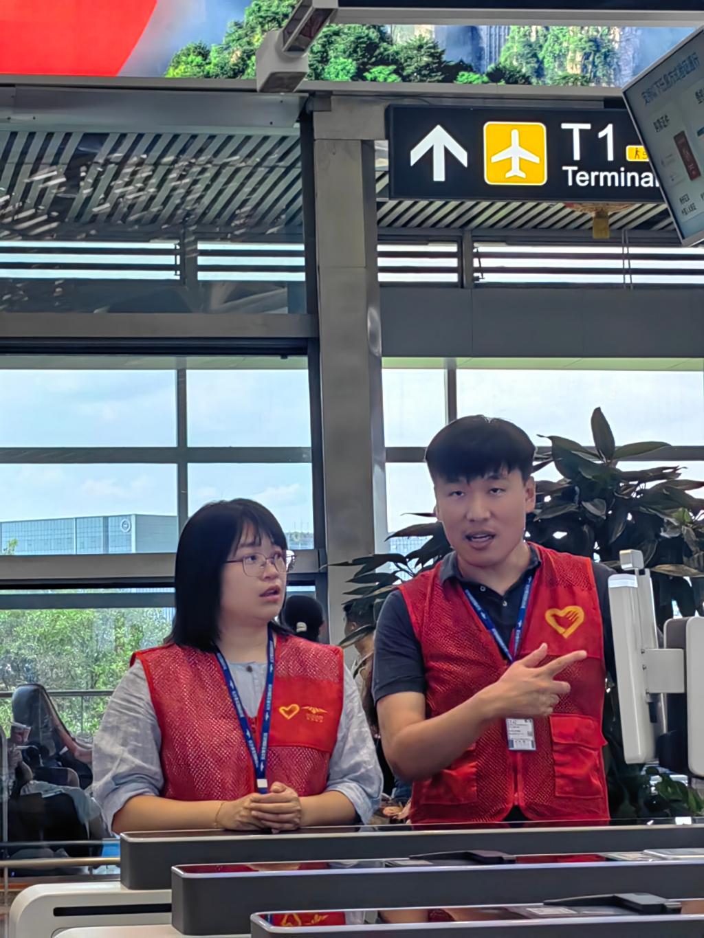 在实践环节中,教师们深入机场运行一线,先后在T1、T2航站楼的国内航班安检区域进行全程观摩学习。从旅客验证到人身检查,从行李安检到应急处置,每一个环节都留下了教师们认真学习的身影。大家不仅仔细观察记录操作流程和技术要点,更在带教老师的指导下亲自参与宣导岗位的实操训练,真正实现了从理论到实践的跨越。