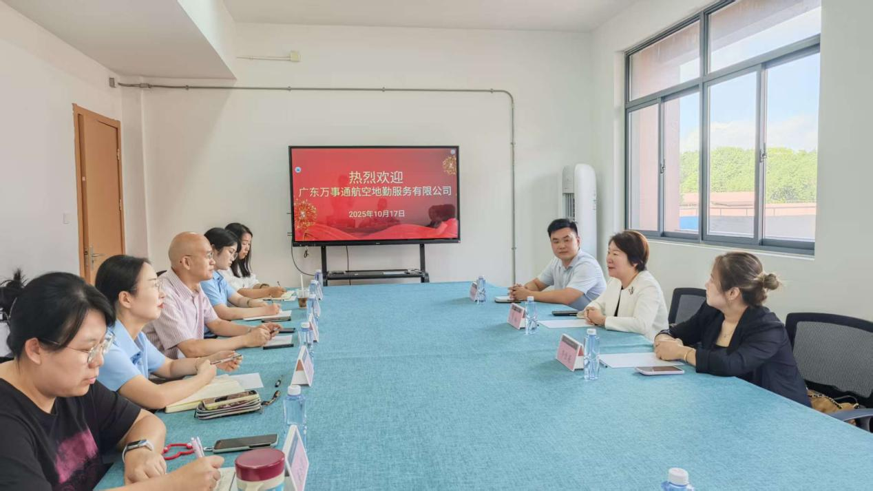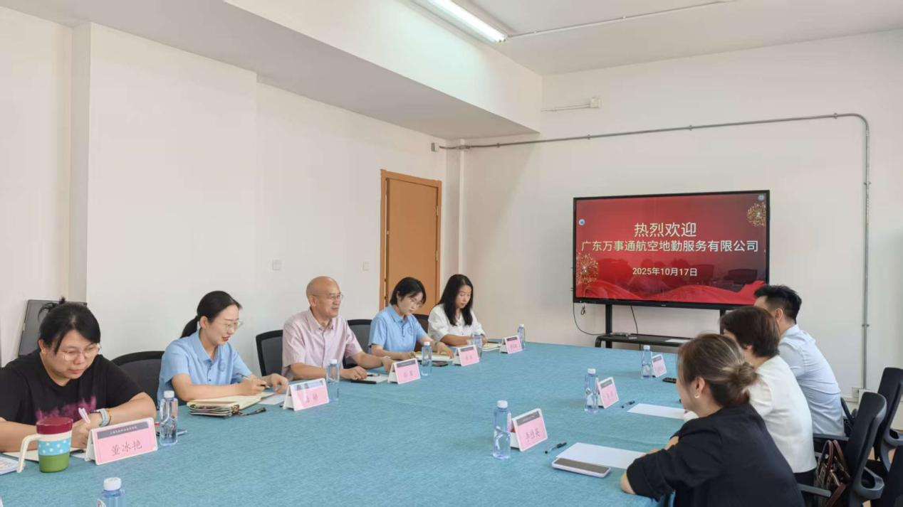 2025年10月17日下午2时,广东万事通航空地勤服务有限公司一行莅临空港管理学院,开展校企合作交流洽谈。空港管理学院党总支书记、院长孙军,党总支副书记柏婷,运行管理教研室主任董冰艳,学工办主任陆薇以及辅导员张文文、张浩、杨坤等对广东万事通航空地勤服务有限公司董事长李冰、翼通航空地勤服务(杭州)有限公司总经理李佳英、广东万事通航空地勤服务有限公司培训学院项目总监林晓山等领导的到来表示热烈欢迎。